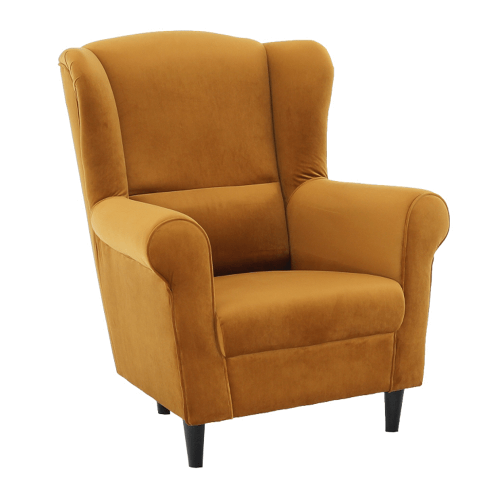 Křeslo-ušák Charlot v hořčičný barevném provedení látky.