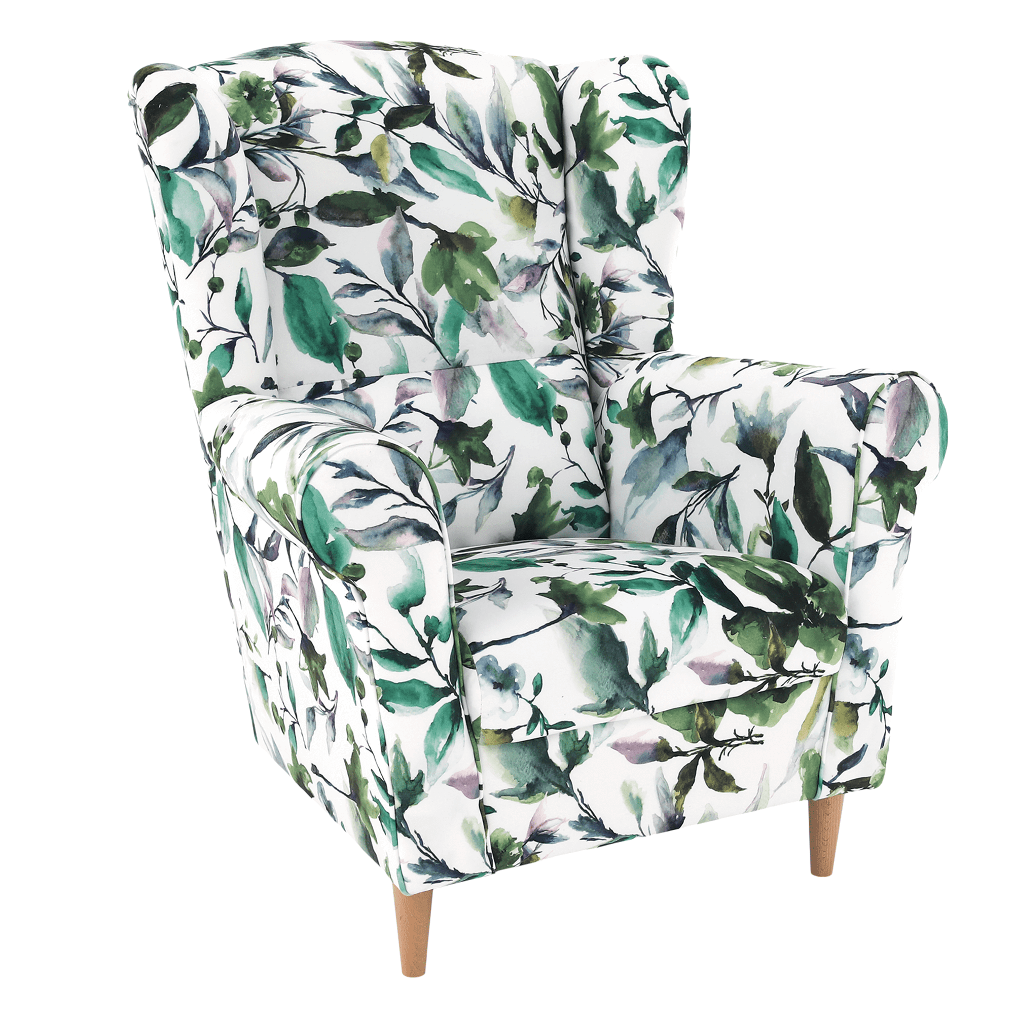 Křeslo ušák, látka vzor listí – nožičky dřevěné, CHARLOT