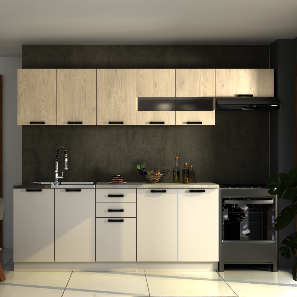 Kuchyňská linka, 2,6 m, dub cremona/kašmír/krémová Navona, MONIA