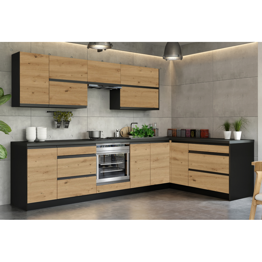 Rohová univerzální kuchyňská linka 300×180, dub artisan/černá, BRECK