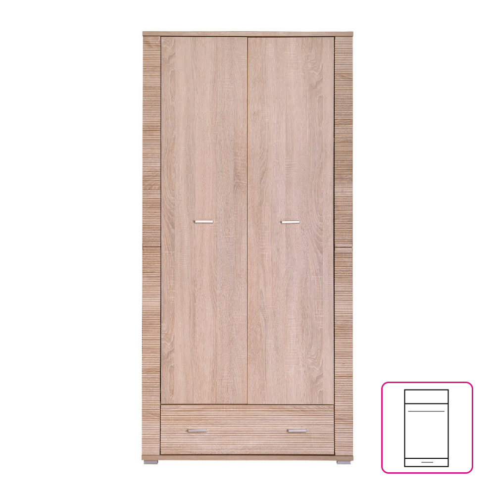 Skříň věšáková s jednou policí typ 03, vhodná na zařízení obývacích pokojů, ložnic i pracoven, materiál: DTD laminovaná. Hrany jednotlivých komponentů jsou ukončeny vroubkovanou lištou. Barevné provedení: dub sonoma. Rozměry (ŠxVxH): 92,8x192x55 cm. Tloušťka materiálu korpus: 16 mm