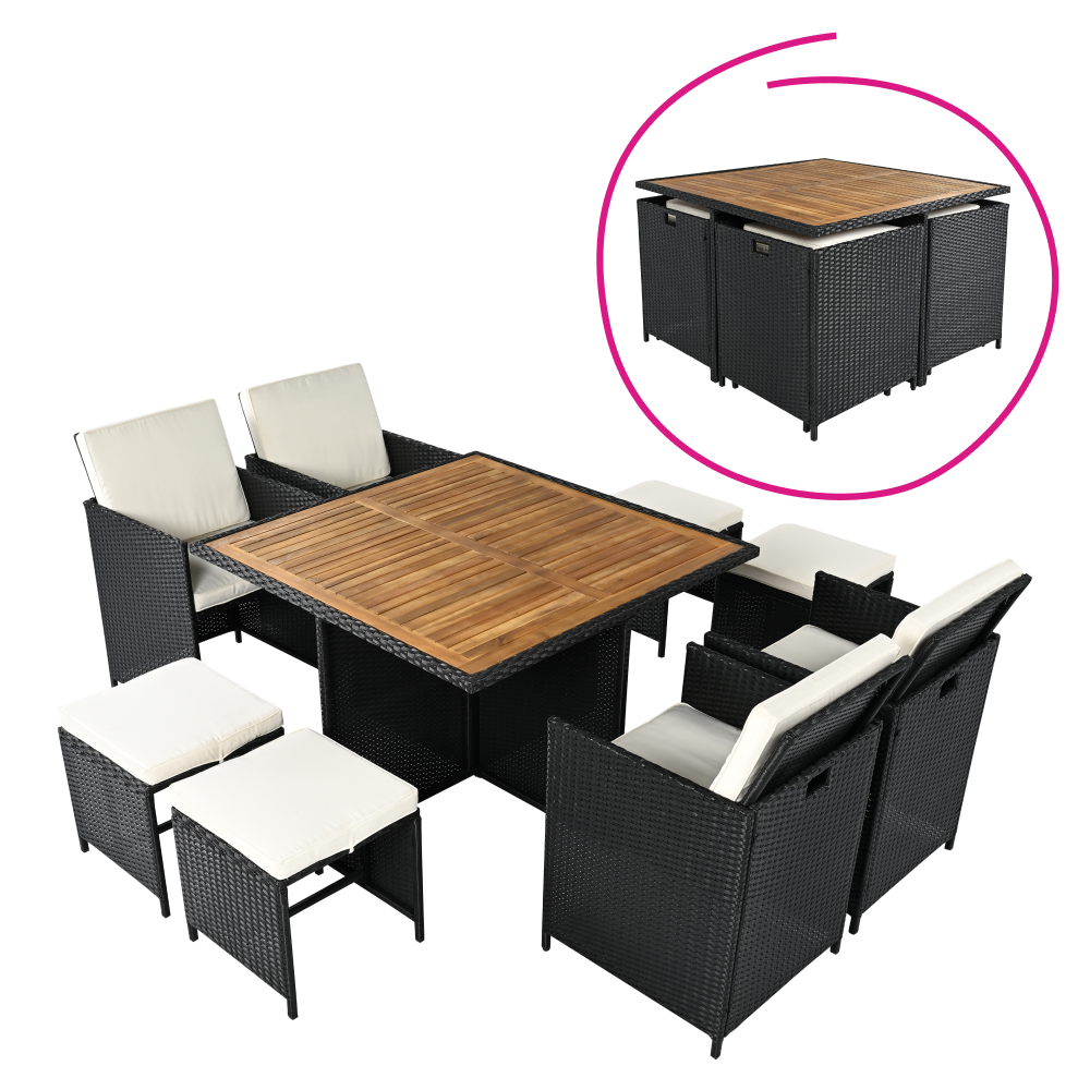 Zahradní ratanový set, akáciové dřevo, černá/krémová/přírodní, MELFORD RP1, rozbalené zboží
